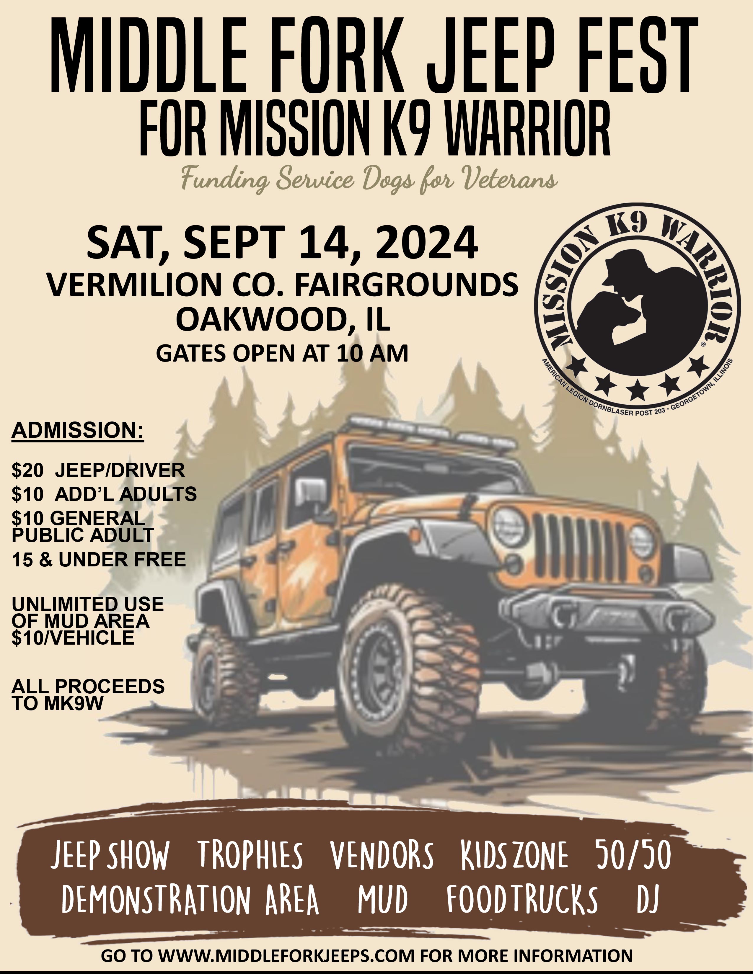 Mission K9 Warrior® is a registered trademark of Dornblaser Post #203 American Legion. Middle Fork Jeep Club and their respective representatives are not affiliated with Dornblaser Post #203 American Legion.